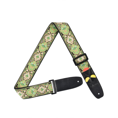 Amumu green vintage jacquard guitar strap with premium leather ends and a widely adjustable length 36" to 63" (button hole to hole) to suit most players. Double layer of materials makes the strap more durable and comfortable. The top layer is made from polyester with vintage pattern embroidery. The back layer is made from soft nylon. If you only have one bottom strap button on your guitar, the included headstock tie can help you get what you need!