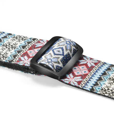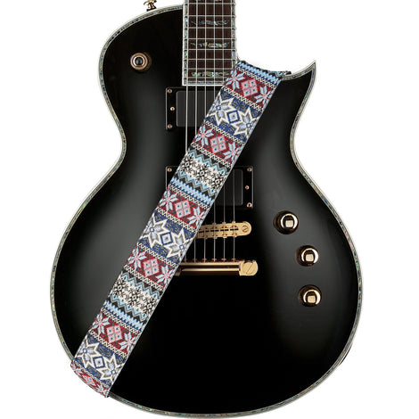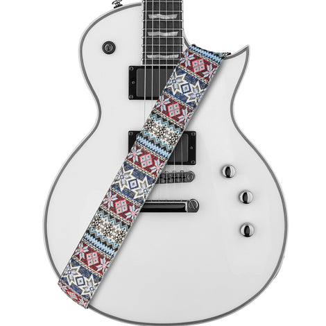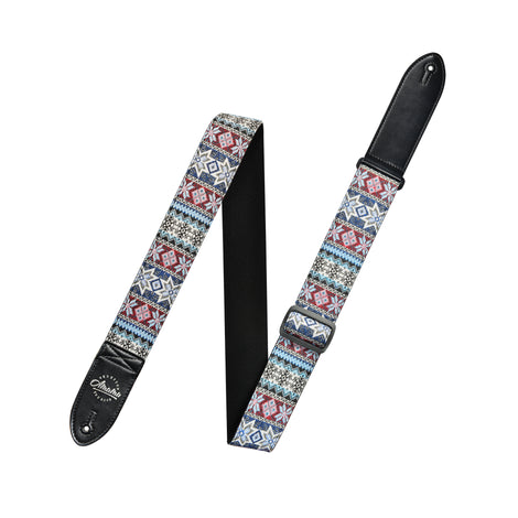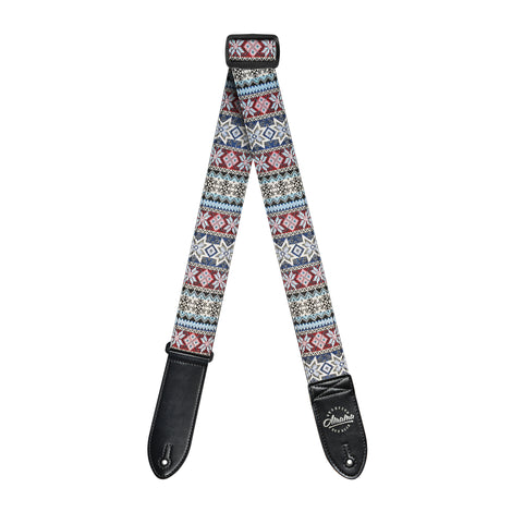 Amumu Jacquard guitar strap with leather ends and a widely adjustable length 34″ to 57.5″ (hole to hole) to suit most players. A double layer of materials makes the strap more durable and comfortable. The top layer is made from polyester with the Jacquard pattern. The back layer is made from soft cotton which gives your shoulder a better comfort when you're playing the guitar. Don’t worry if you only have one bottom strap button on your guitar, the included headstock tie can help you get what you need!