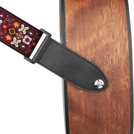 Bring retro energy to the stage with the AMUMU Jimi Vintage Guitar Strap – a bold blend of psychedelic charm, heavy-duty craftsmanship, and all-day comfort. The 2-inch jacquard-woven pattern features vibrant red, gold, and white floral-tribal mosaics, echoing the timeless aesthetic of 60s rock legends.