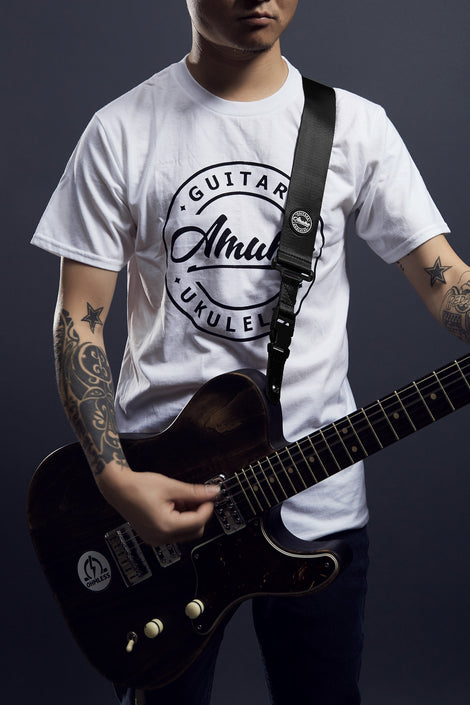 Amumu seatbelt guitar strap with leather ends and a widely adjustable length 35″ to 63″ (hole to hole) to suit most players. The strap belt is made from durable seat belt material nylon and the clips on strap ends for fast and easy guitar changing.