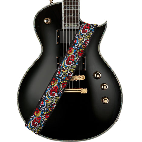 Amumu love and flower guitar strap with premium leather end and a widely adjustable length 37" to 63" (buttonhole to hole) to suit most players. Double layers of materials make the strap more durable and comfortable. The top layer is made from polyester with vintage pattern jacquard. The back layer is made from soft nylon. If you only have one bottom strap button on your guitar, the included headstock tie can help you get what you need!