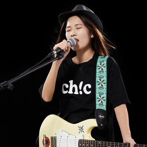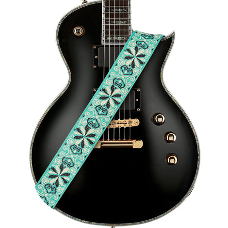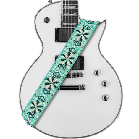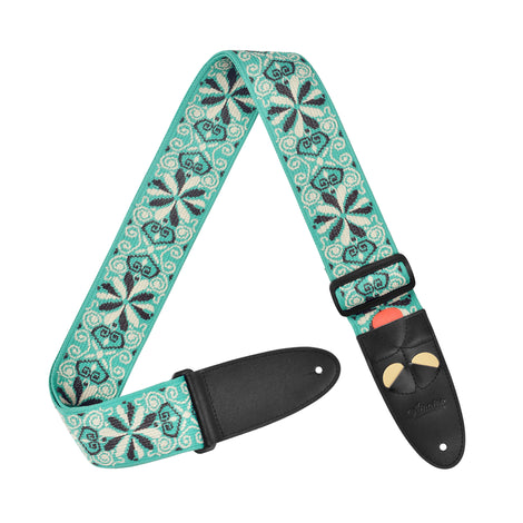 Amumu Hootenanny guitar strap with leather ends and a widely adjustable length 35″ to 61″ (hole to hole) to suit most players. The Hootenanny pattern is jacquard woven into the belt material polyester. 2.3" width gives your shoulder a better comfort when you're playing the guitar.
