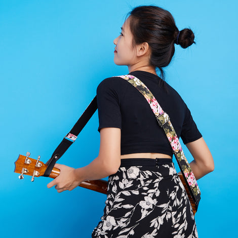 Amumu peony ukulele strap with leather ends and a widely adjustable length 30ā³ to 52ā³ (strap button hole to hole) to suit most children and adults. Double layers of materials make the strap more durable and comfortable. The top layer is made from denim with peony pattern printed. The back layer is made from soft cotton which gives your shoulder a better comfort when you're playing your ukulele.