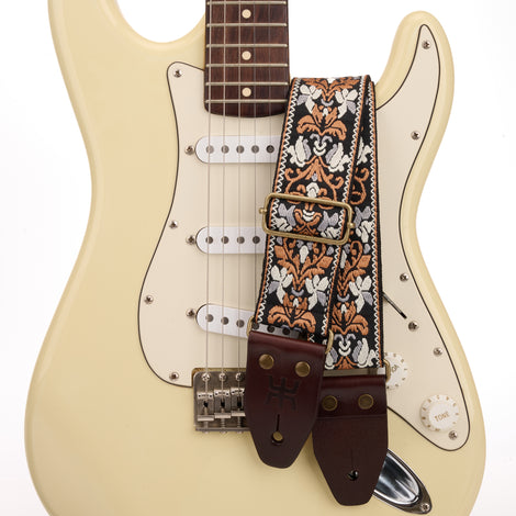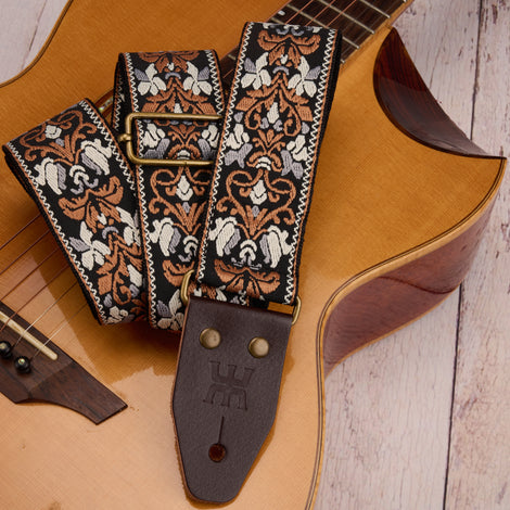 Introducing the AMUMU **SPH-GSB-TGBN** 2" wide Black Brown Spades Heart guitar strap with elegant retro embroidered patterns, perfect for complementing various guitar styles. The soft cotton ensures a comfortable, skin-friendly feel, relieving pressure during long performances.