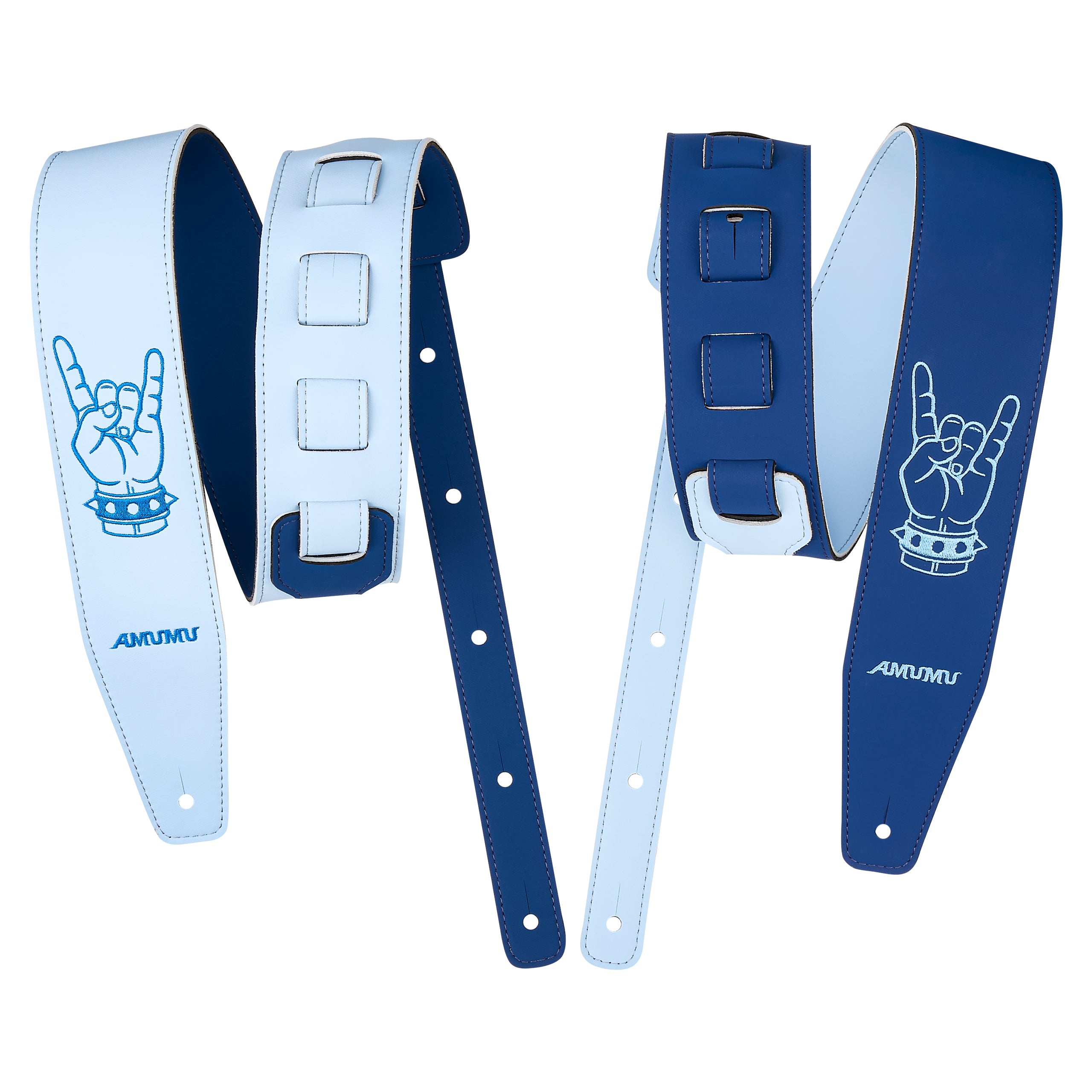 The AMUMU MFL-DTS-GS-RH-NVLB Reversible Guitar Strap features iconic rock hand embroidery with dual-tone navy blue microfiber leather. Designed with a 2.5” wide comfort profile and adjustable 94–160 cm length, it delivers durability, understated style, and performance for acoustic, electric, and bass guitars.