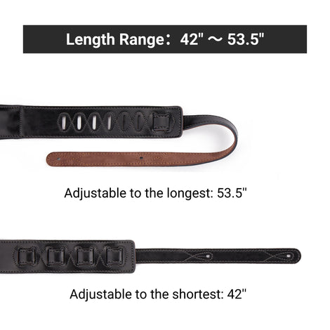 Amumu LE04-BK is a 3.1 inches width leather guitar strap. The top layer is made from Cowhide leather. The back layer is made from soft PU leather with EVA foam padding that takes the strain off your shoulders and neck with a soft and comfortable. 42-53.5 inches adjustable length to suit most players, the perfect companion for Acoustic, Electric, and Bass Guitars. If you only have one bottom strap button on your guitar, the included headstock button tie can help you get what you need!
