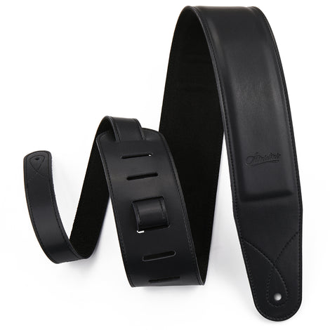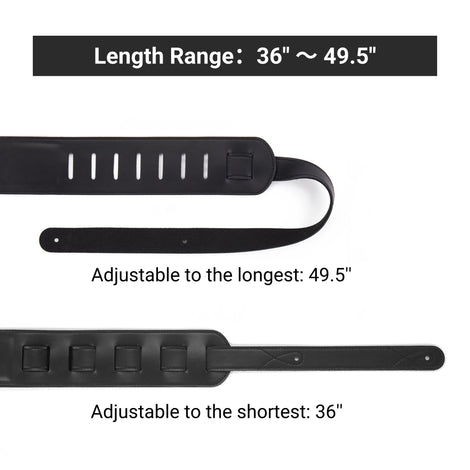 Amumu ML01-BK is a 2.5" microfiber leather guitar strap with EVA foam padding that takes the strain off your shoulders and neck with a soft and comfortable. Adjustable from 36” to 49.5" to suit most players. If you only have one bottom strap button on your guitar, the included headstock button tie can help you get what you need!