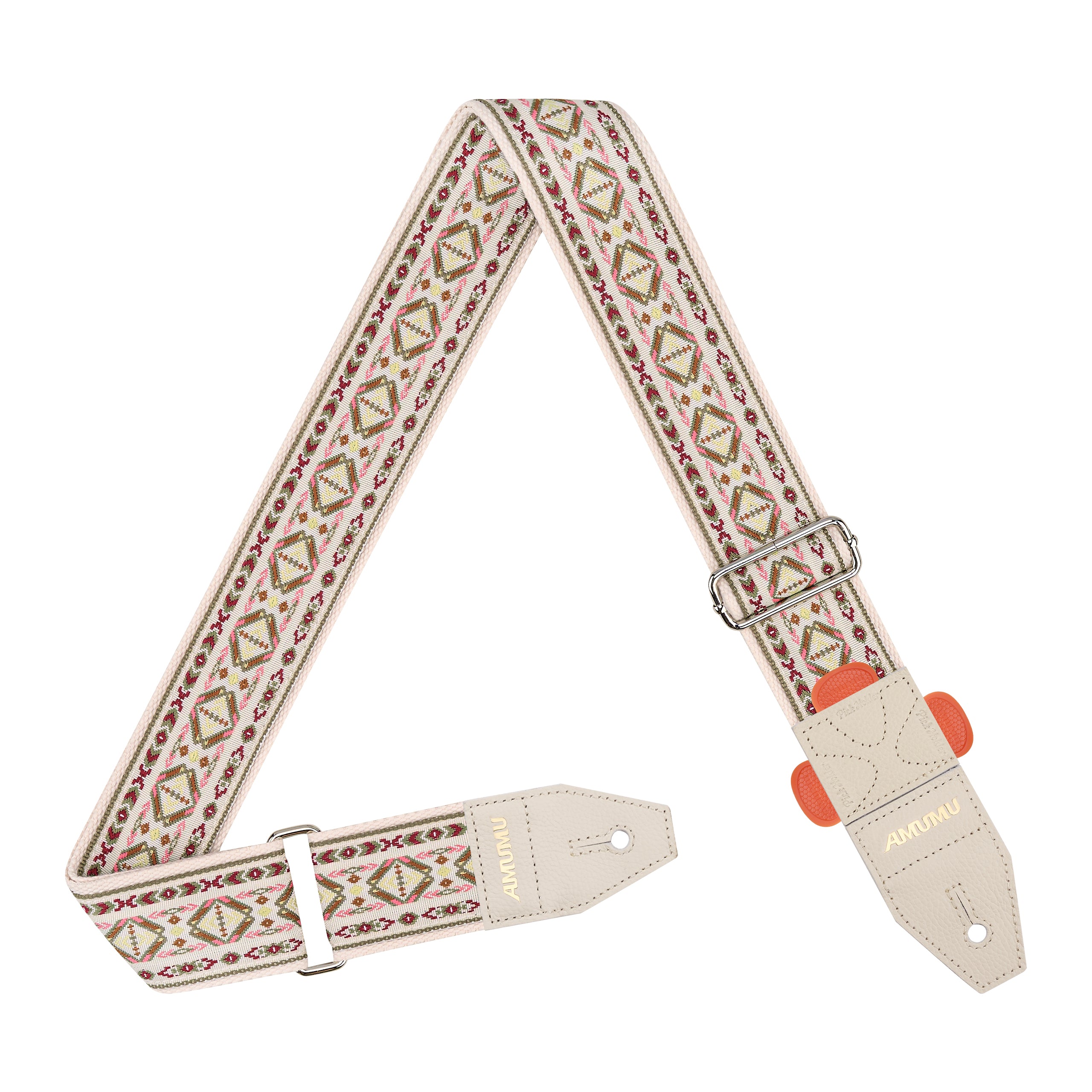 The AMUMU CO59J-CR-R Boho Weave Guitar Strap features a cream jacquard cotton blend webbing paired with double-layer top grain leather ends, a 120kg-rated metal loop buckle, and a patented pick holder. Adjustable from 92–160cm, it delivers premium comfort, secure support, and timeless boho style for acoustic, electric, and bass guitars.
