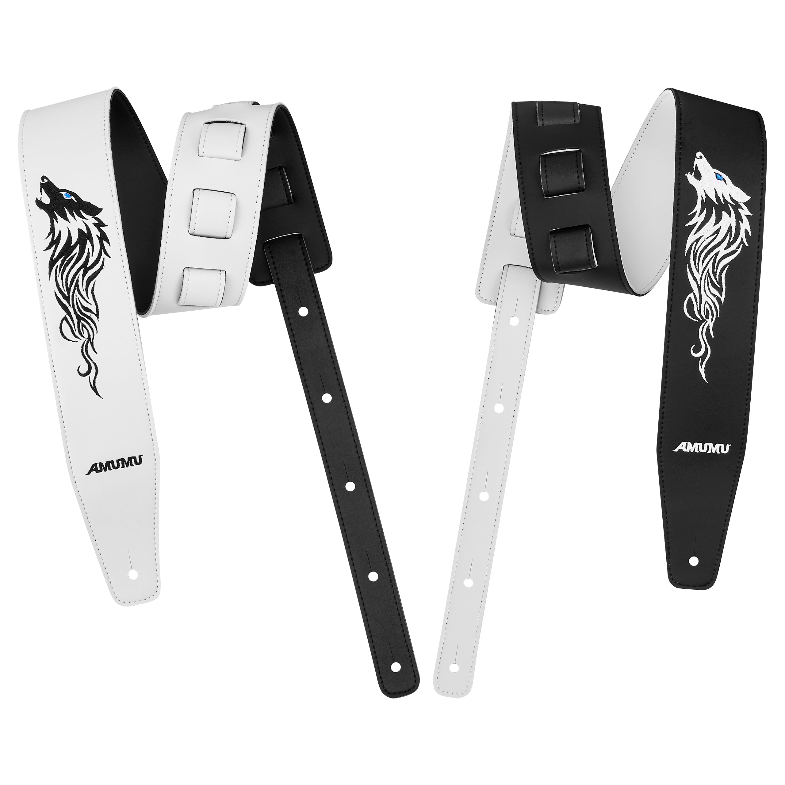 The AMUMU MFL-DTS-AN-WLF-BKWH Reversible Guitar Strap features bold wolf totem embroidery and premium dual-tone microfiber leather construction. With a comfortable 2.5" wide design and adjustable 94–160 cm length, this strap delivers durability, style, and performance for electric, acoustic, and bass guitars.