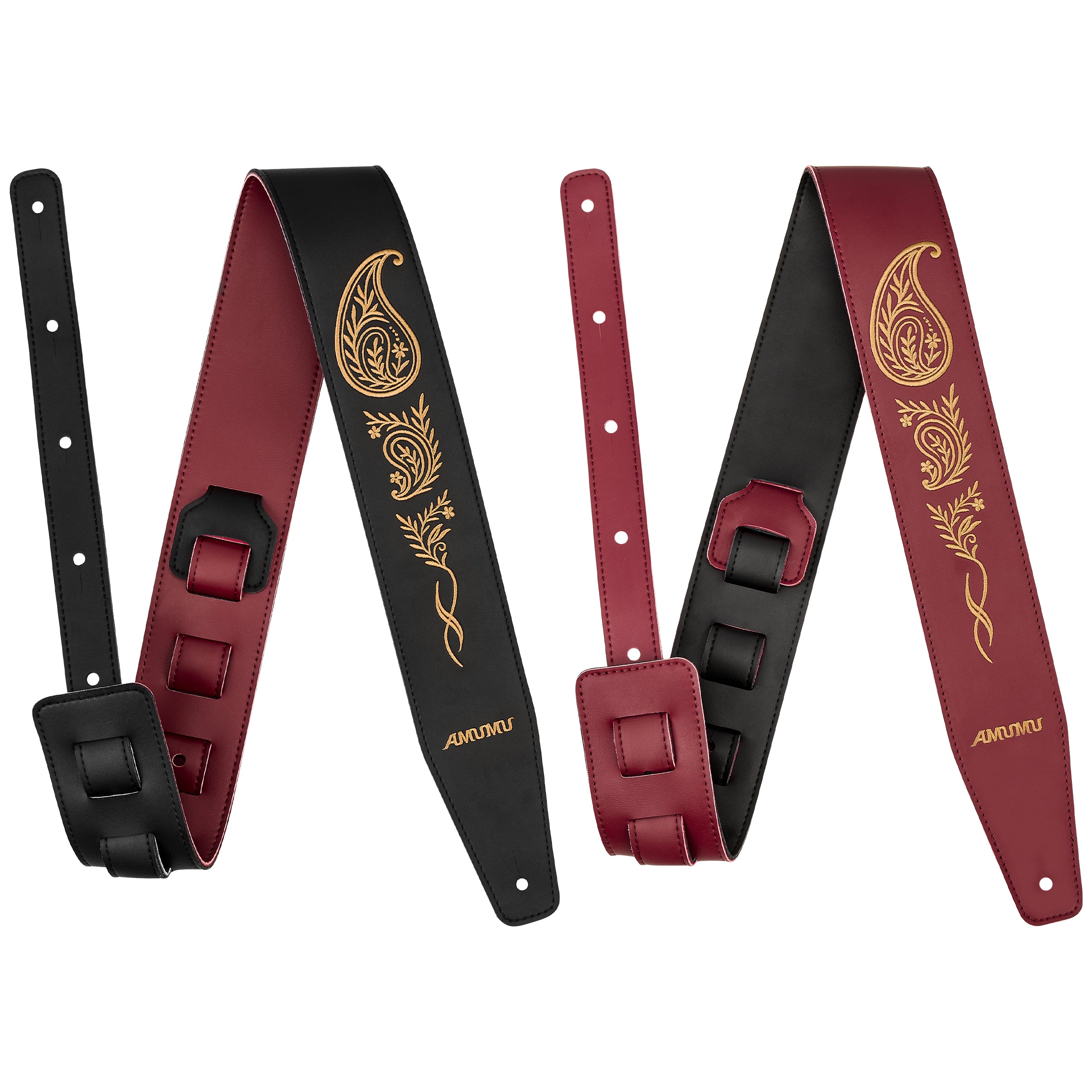 The AMUMU MFL-DTS-PL-VIN-BKBG Reversible Guitar Strap features intricate paisley vine embroidery with dual-tone black and burgundy microfiber leather. Designed with a 2.5” wide comfort profile and adjustable 94–160 cm length, it delivers durability, vintage elegance, and performance for acoustic, electric, and bass guitars.