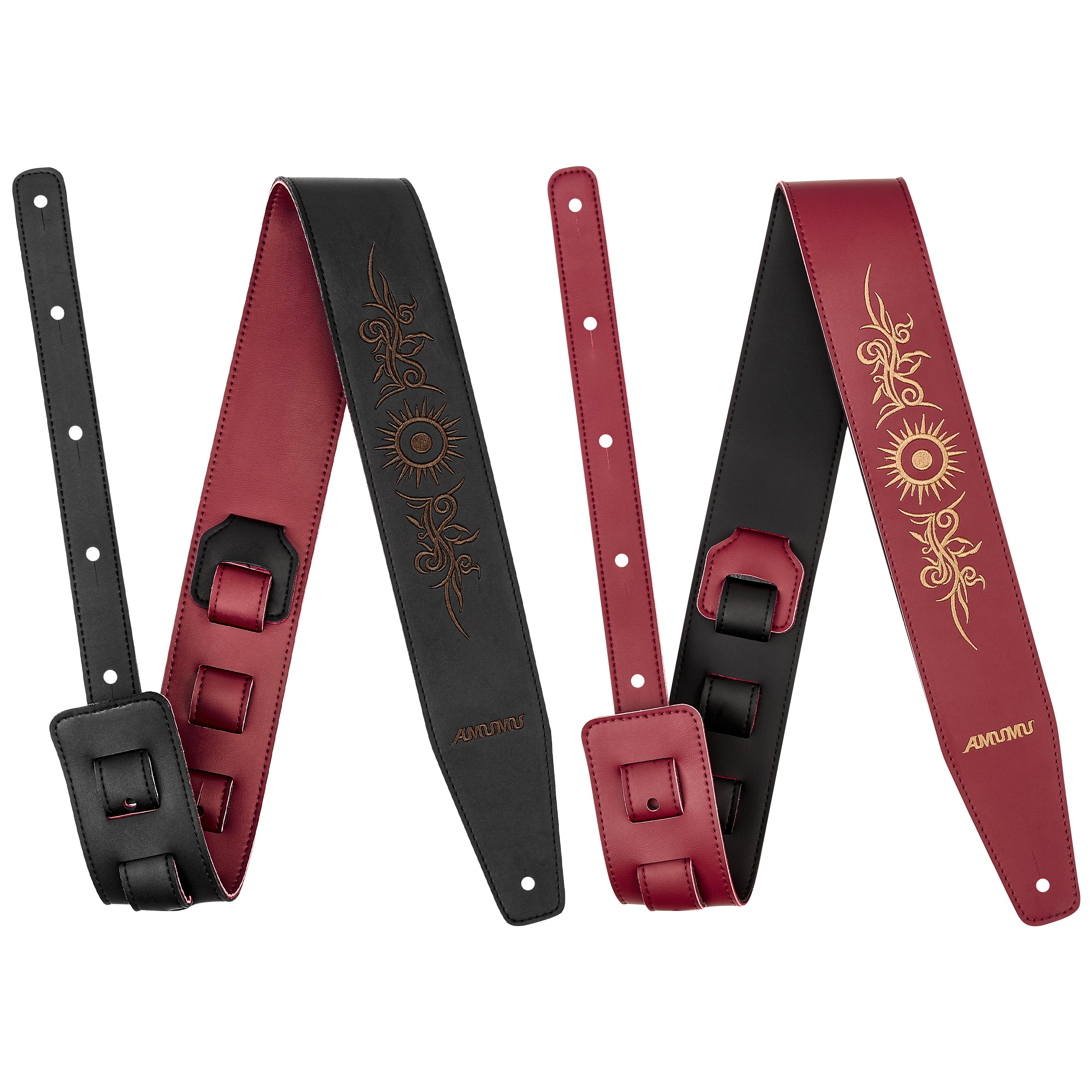 The AMUMU MFL-DTS-SB-VIN-BKBG Reversible Guitar Strap features elegant sunburst vine embroidery with dual-tone burgundy and black microfiber leather. Designed with a 2.5” wide comfort profile and adjustable 94–160 cm length, it delivers durability, refined style, and performance for acoustic, electric, and bass guitars.