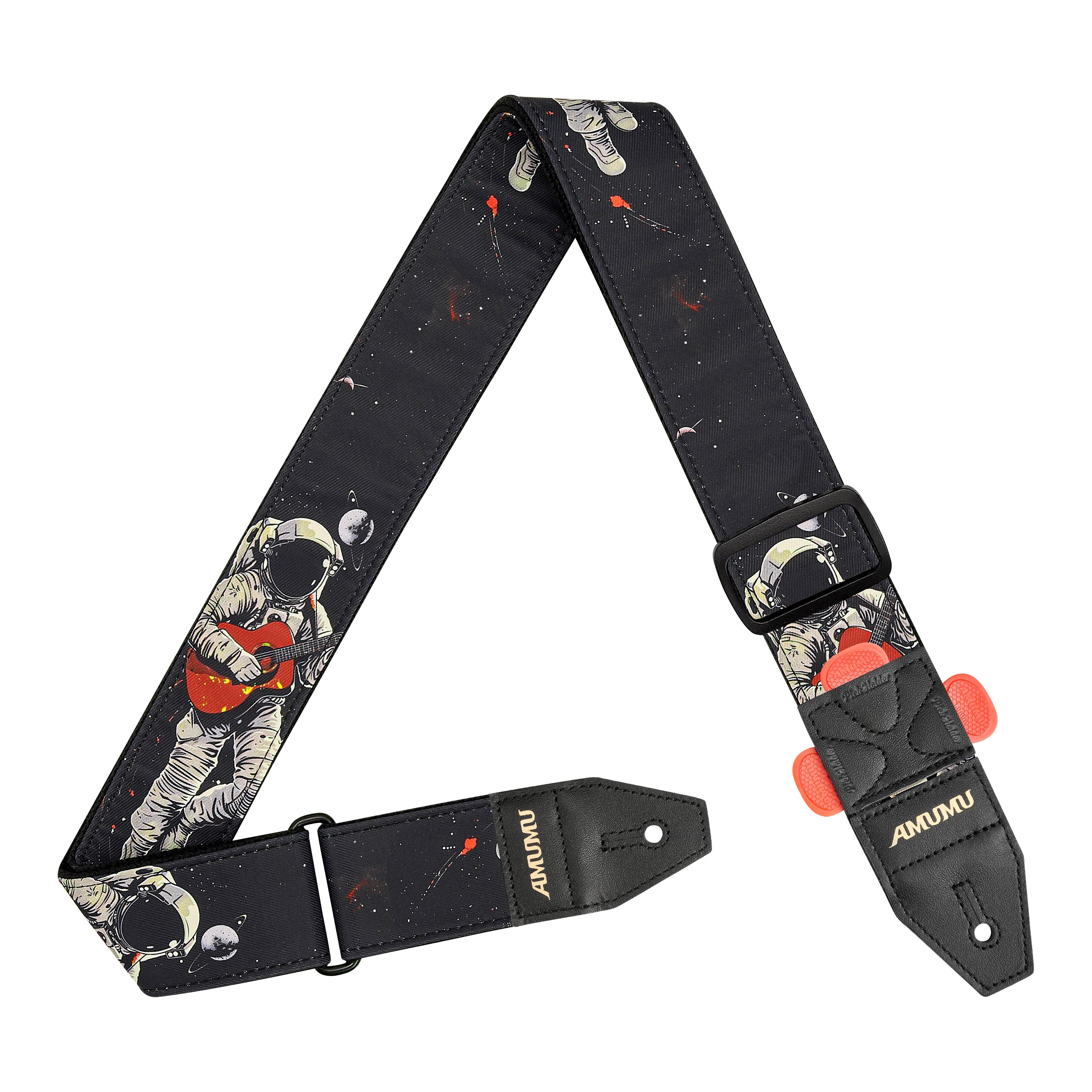 The AMUMU PET13P-BW-R features the Zero Gravity Serenade black–white print on durable 2" polyester webbing, paired with top grain leather ends for strong and scratch-resistant performance. Adjustable from 96–160cm, it combines bold style, comfort, and reliability for acoustic, electric, and bass guitars.
