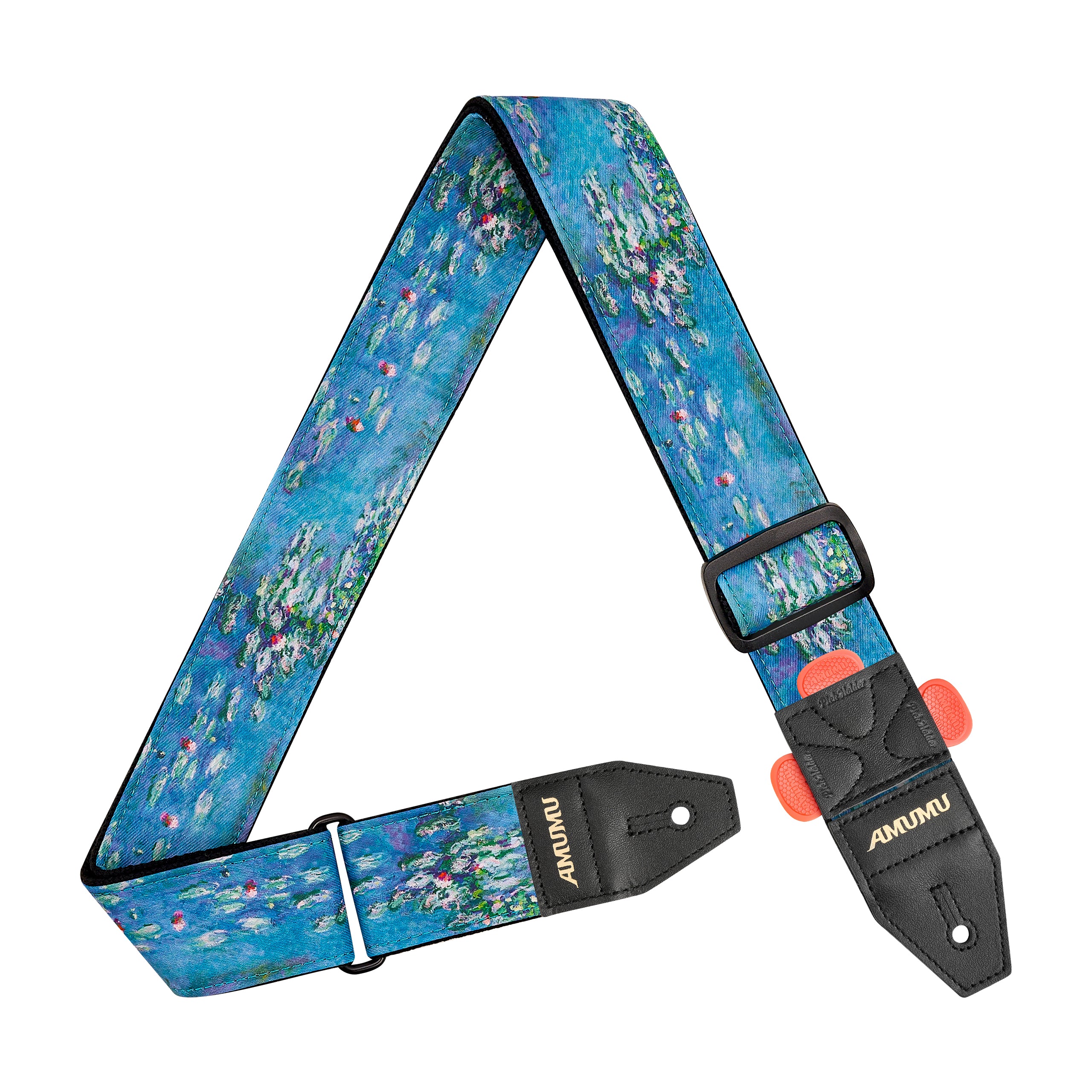 The AMUMU PET17P-BG-R features the Waterlily Reflections blue–green print on strong 2" polyester webbing with top grain leather ends and anti-scratch protection. Adjustable from 96–160cm, it offers comfort, durability, and a tranquil artistic style for acoustic, electric, and bass guitars.