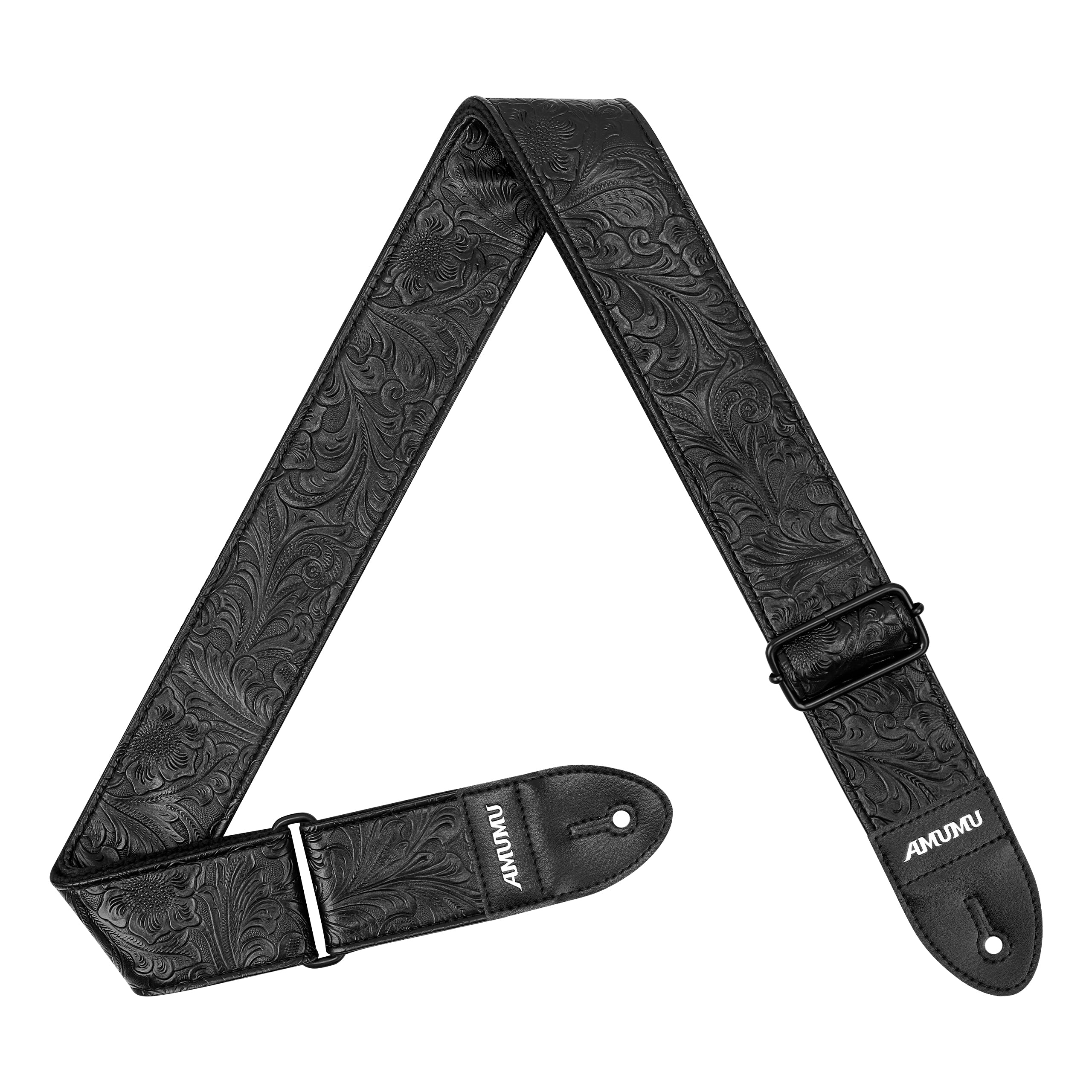 The AMUMU PVC07EB-BK-V Black Vine Guitar Strap features a subtle embossed black vine pattern on durable PVC leather, paired with a soft cotton blend backing and reinforced vegan leather ends. Adjustable from 92–160cm, it delivers minimalist style, comfort, and dependable support for acoustic, electric, and bass guitars.