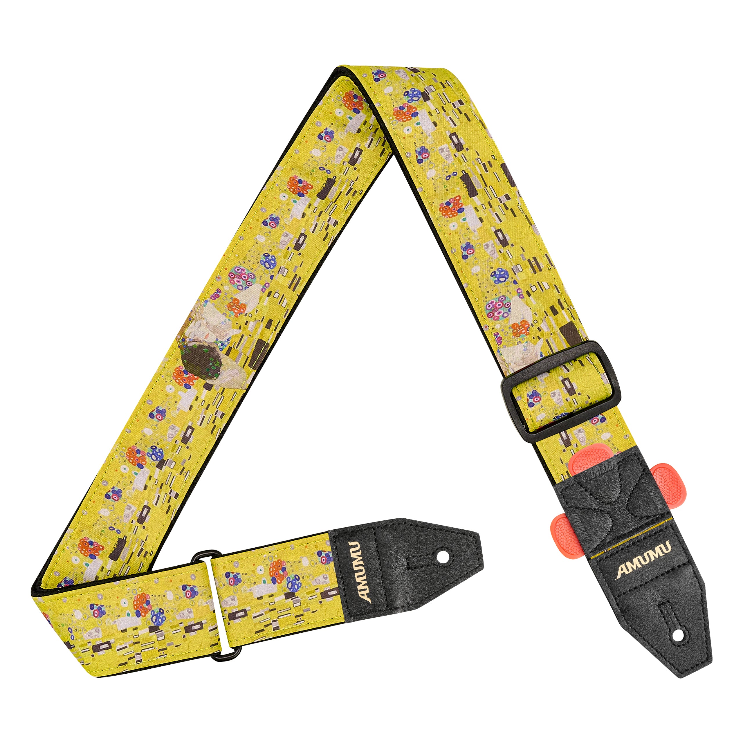 The AMUMU PET19P-YL-R features the Golden Embrace yellow print on strong 2" polyester webbing with premium top grain leather ends for secure, scratch-resistant performance. Adjustable from 96–160cm, it combines bright style, durability, and comfort for acoustic, electric, and bass guitars.