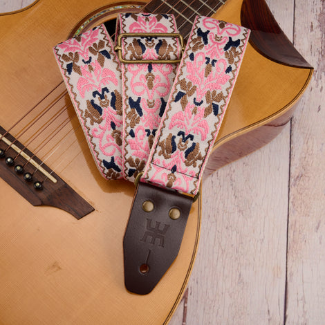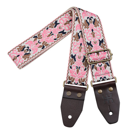 Introducing the AMUMU **SPH-PGB-TGBN** 2" wide Pink Spades Heart guitar strap with elegant retro embroidered patterns, perfect for complementing various guitar styles. The soft cotton ensures a comfortable, skin-friendly feel, relieving pressure during long performances.