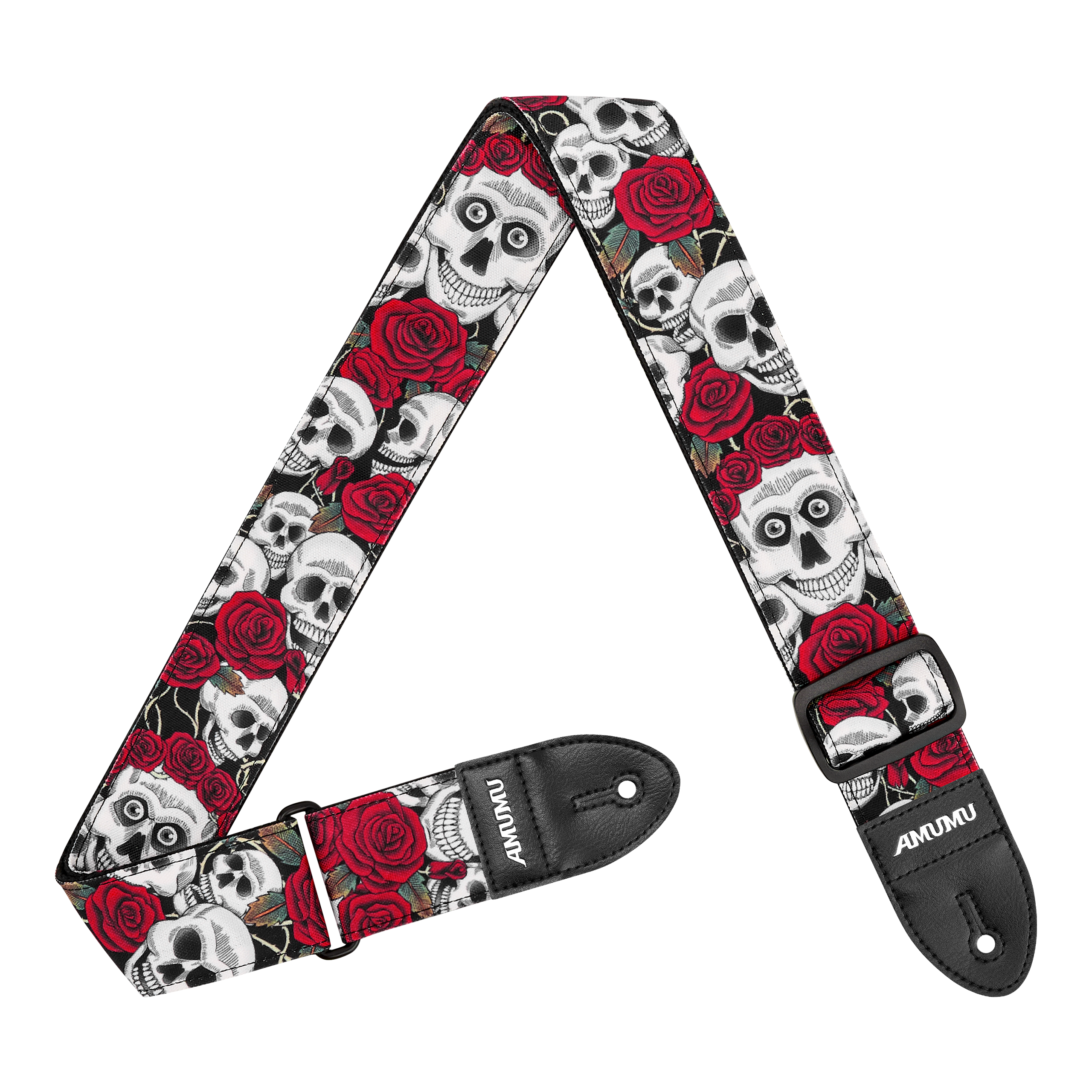 AMUMU CV06P-RW-V 2" Guitar Strap – Skull Rose Red White Printed Canvas with Vegan Leather Ends, Adjustable for Acoustic, Electric & Bass Guitars