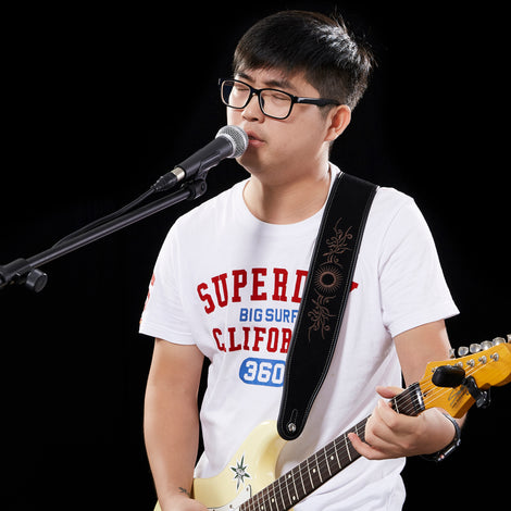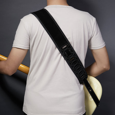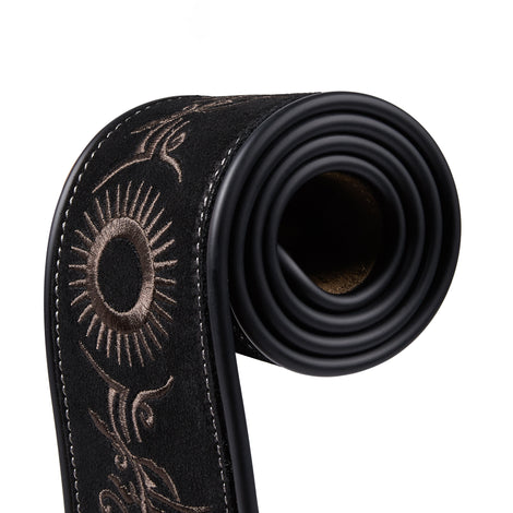 AMUMU Embroidered Totem Guitar Strap Black Premium Suede Leather -LE01E-BK