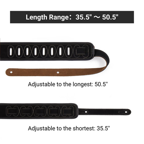 This guitar strap with a widely adjustable length of 35.5" to 50.5"(buttonhole to hole) suits most players. A double layer of materials makes the strap more durable and comfortable. The top layer is made from black premium suede leather with flower pattern embroidery. The back layer is made from brown suede leather. If you only have one bottom strap button on your guitar, the included headstock button tie can help you get what you need!