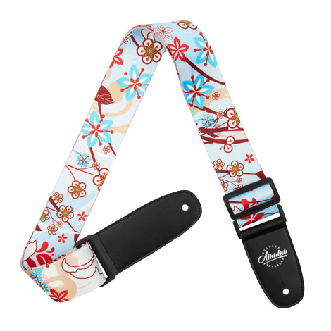Amumu Lily flower guitar strap with leather ends and a widely adjustable length 35″ to 61″ (hole to hole) to suit most players. The strap belt is made from durable polyester cotton which gives your shoulder a better comfort when you're playing the guitar.