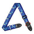 The AMUMU PC16P-BL-V Stellar Reverie Guitar Strap features a deep blue, cosmic-inspired swirl print on durable 2" polyester webbing, reinforced with vegan leather ends and equipped with three Quick-Fetch pick holders. Adjustable from 94–160cm, it delivers modern style, comfort, and dependable performance for acoustic, electric, and bass guitars.
