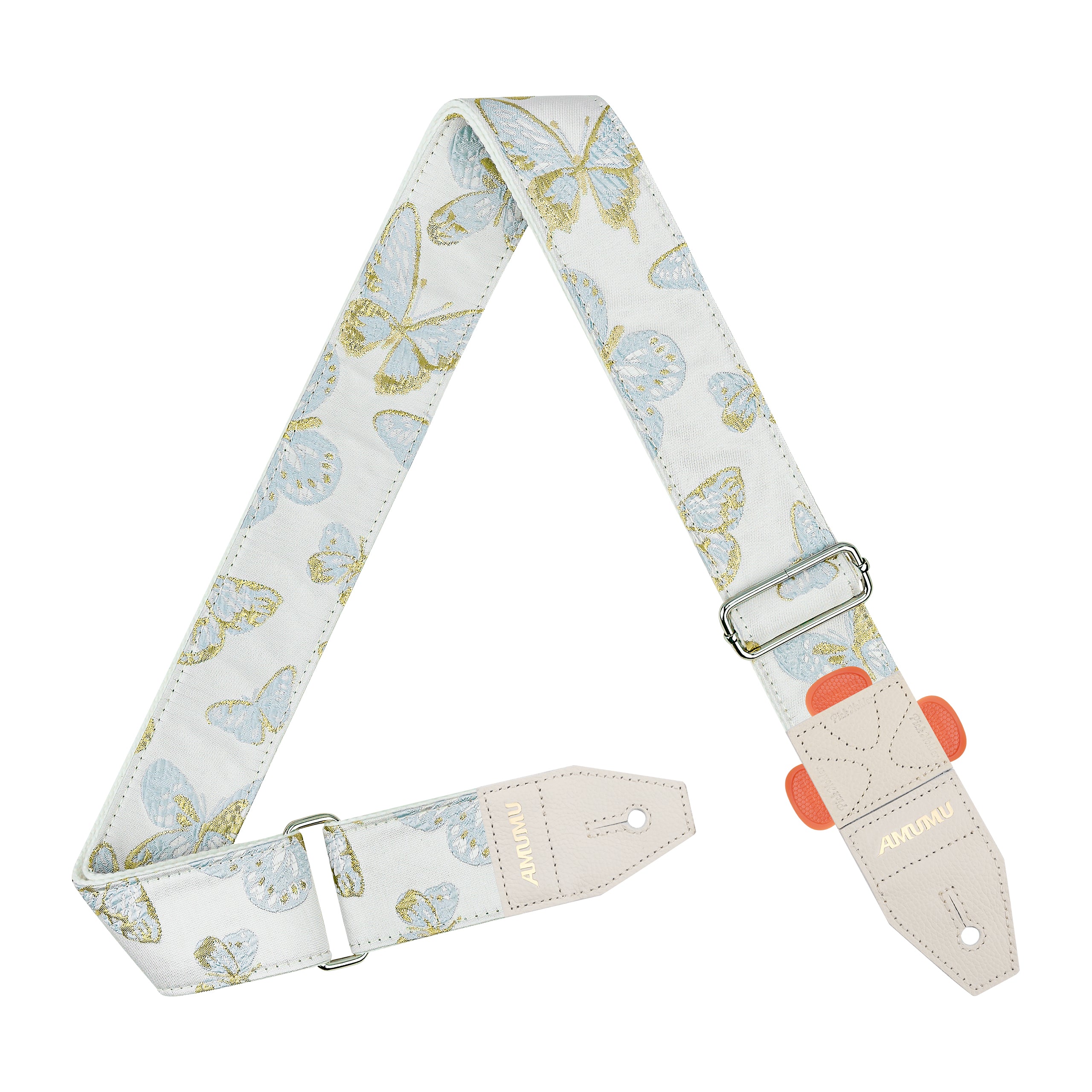 The AMUMU PET08J-BW-R Golden Butterfly Guitar Strap features a blue-and-white jacquard butterfly pattern paired with reinforced top grain leather ends and a patented pick holder. Adjustable from 96–160cm, it combines elegant design, secure performance, and all-day comfort for acoustic, electric, and bass guitars.