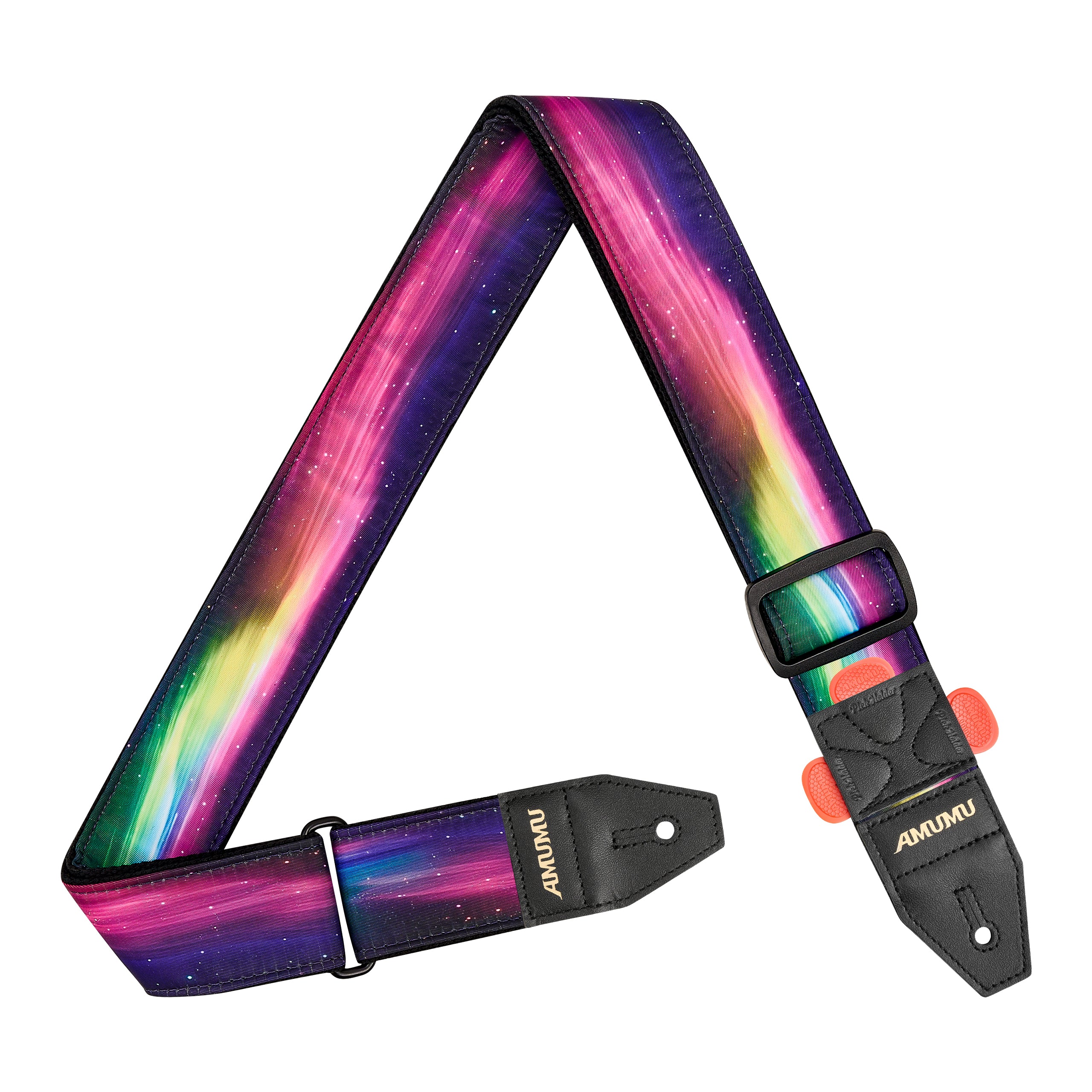 The AMUMU PET15P-ML-R features the Aurora Radiance multicolor print on durable 2" polyester webbing, reinforced with top grain leather ends for strength and anti-scratch protection. Adjustable from 96–160cm, it combines vivid style, comfort, and reliability for acoustic, electric, and bass guitars.